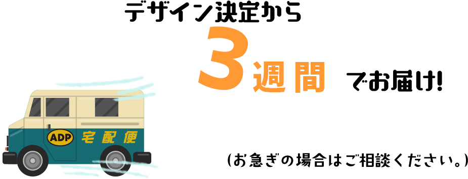 通常納期は、ご注文いただいた日から6週間での納品を予定しております。デザインが決定すればそこから約3週間で納品いたします。スタッフが指定した「デザイン確定日」を過ぎてもデザインが決まらない場合やご連絡が取れない場合は、ご希望の商品受取日に間に合わない可能性がありますので十分にご注意ください。